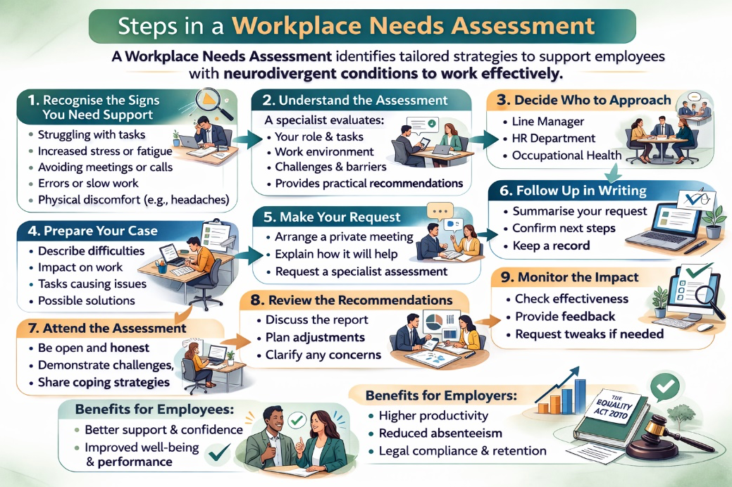Importantly, a formal diagnosis is not required to initiate a workplace assessment. The focus is not on labelling, but on understanding how someone’s working environment, role demands and individual strengths interact — and what practical changes may help.